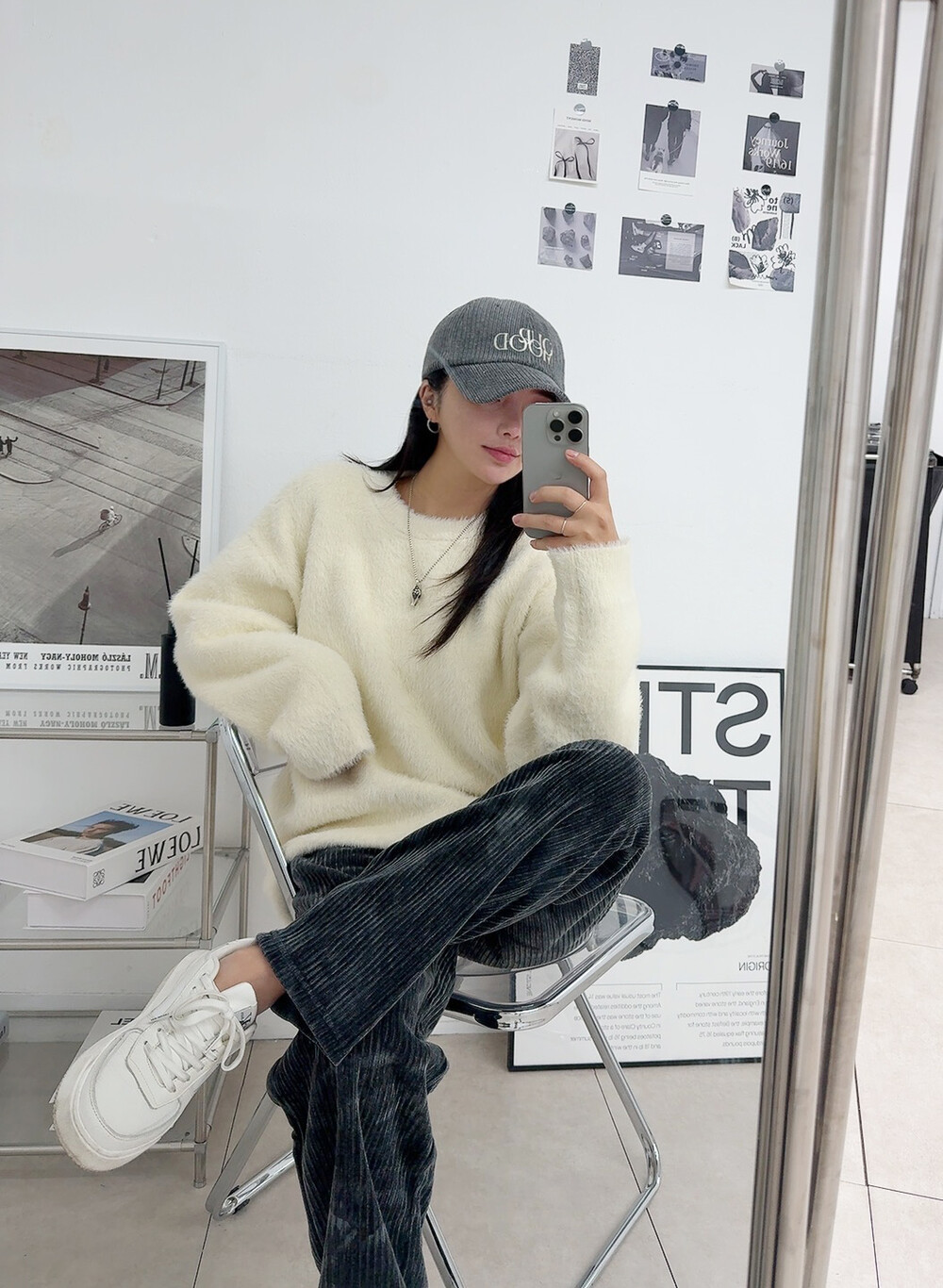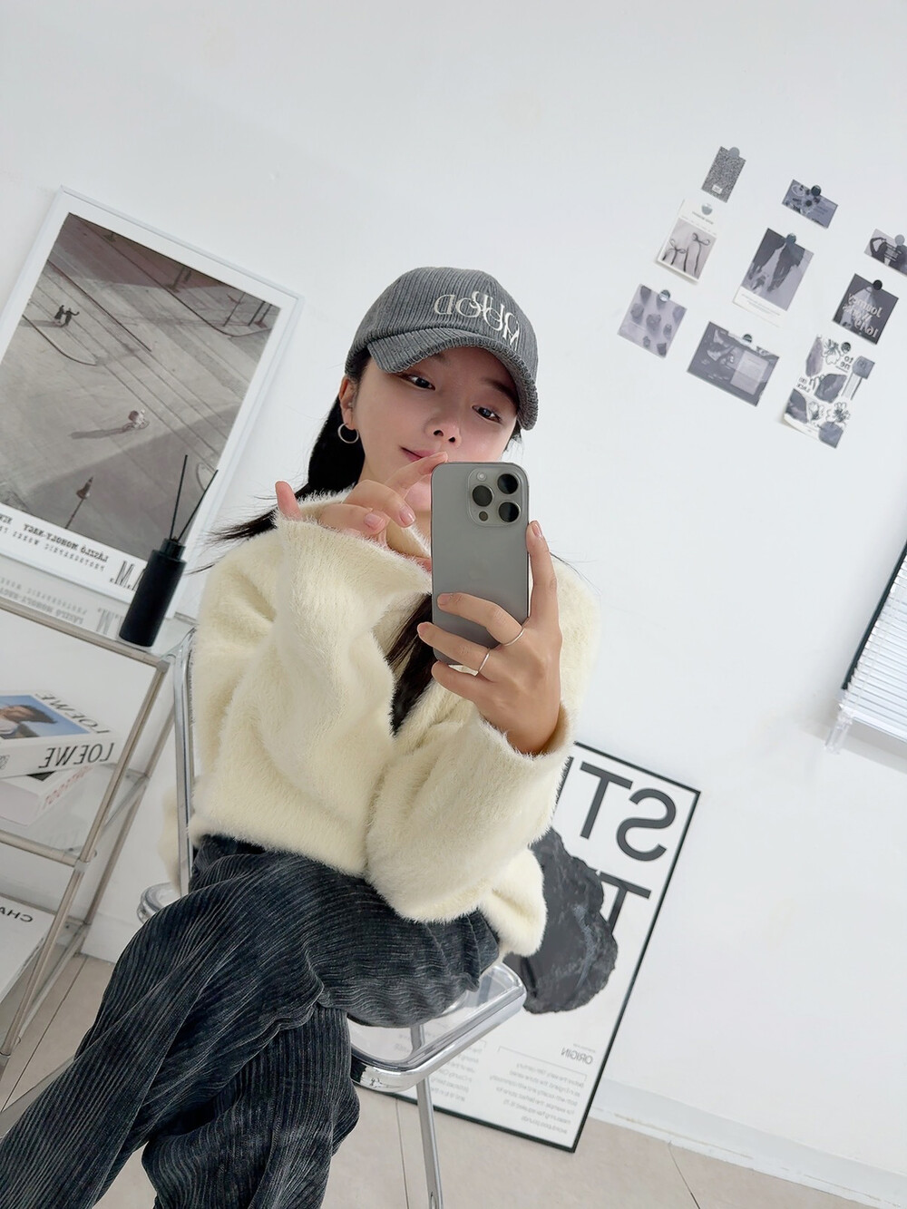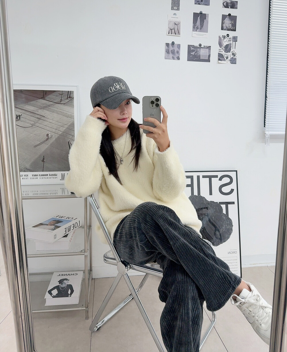 니트 : 아이보리 / 모자 : 차콜 / 팬츠 : 차콜