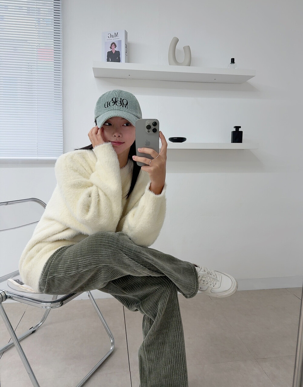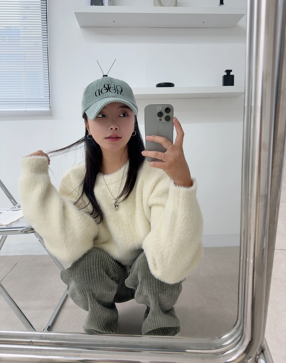 니트 : 아이보리 / 모자 : 민트 / 팬츠 : 카키