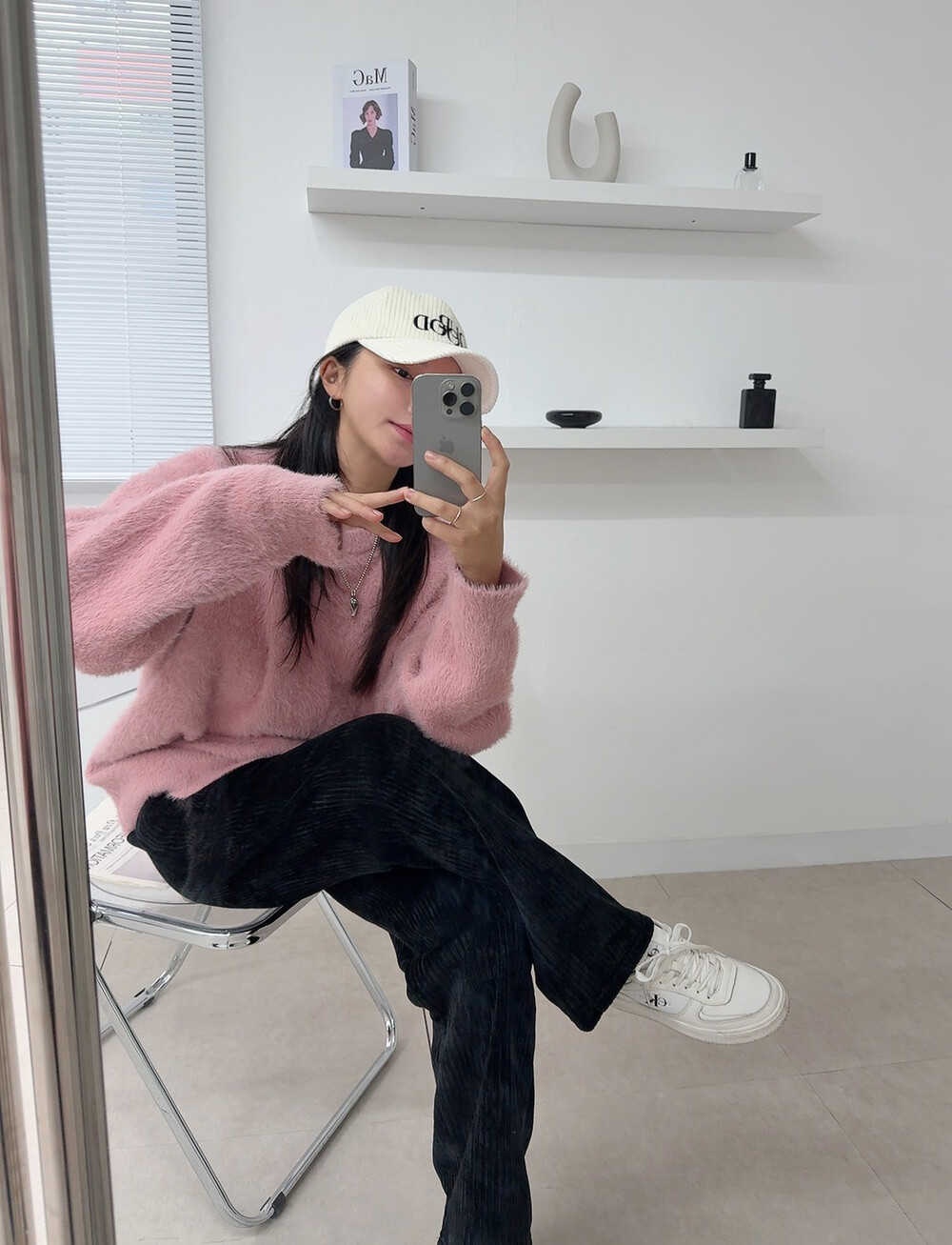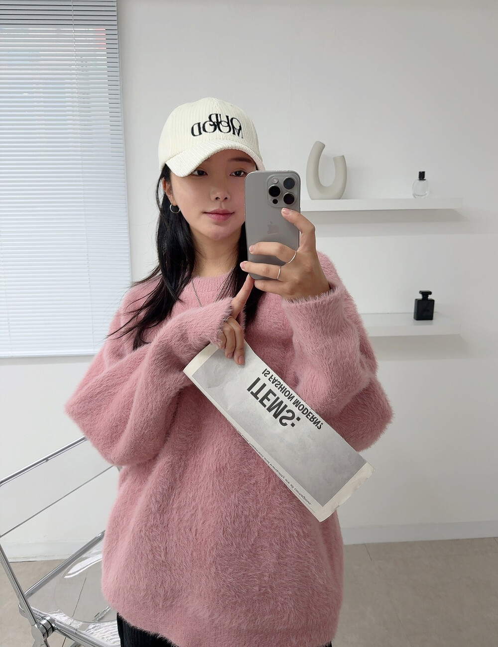 니트 : 핑크 / 모자 : 아이보리 / 팬츠 : 블랙