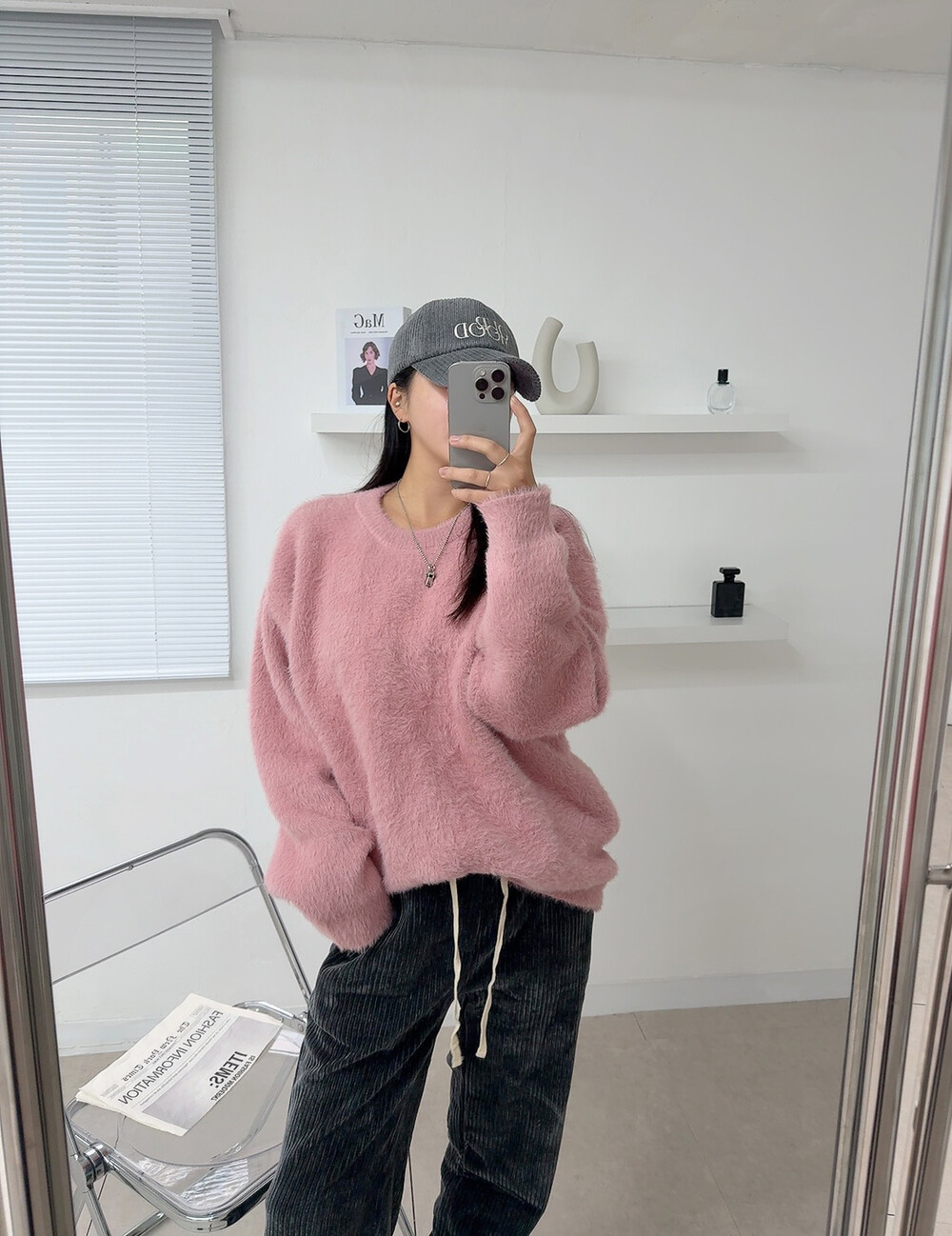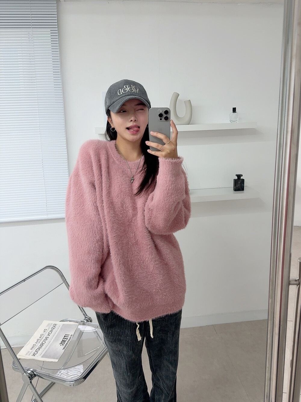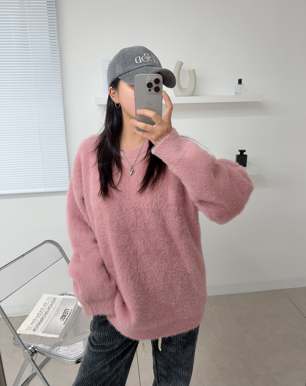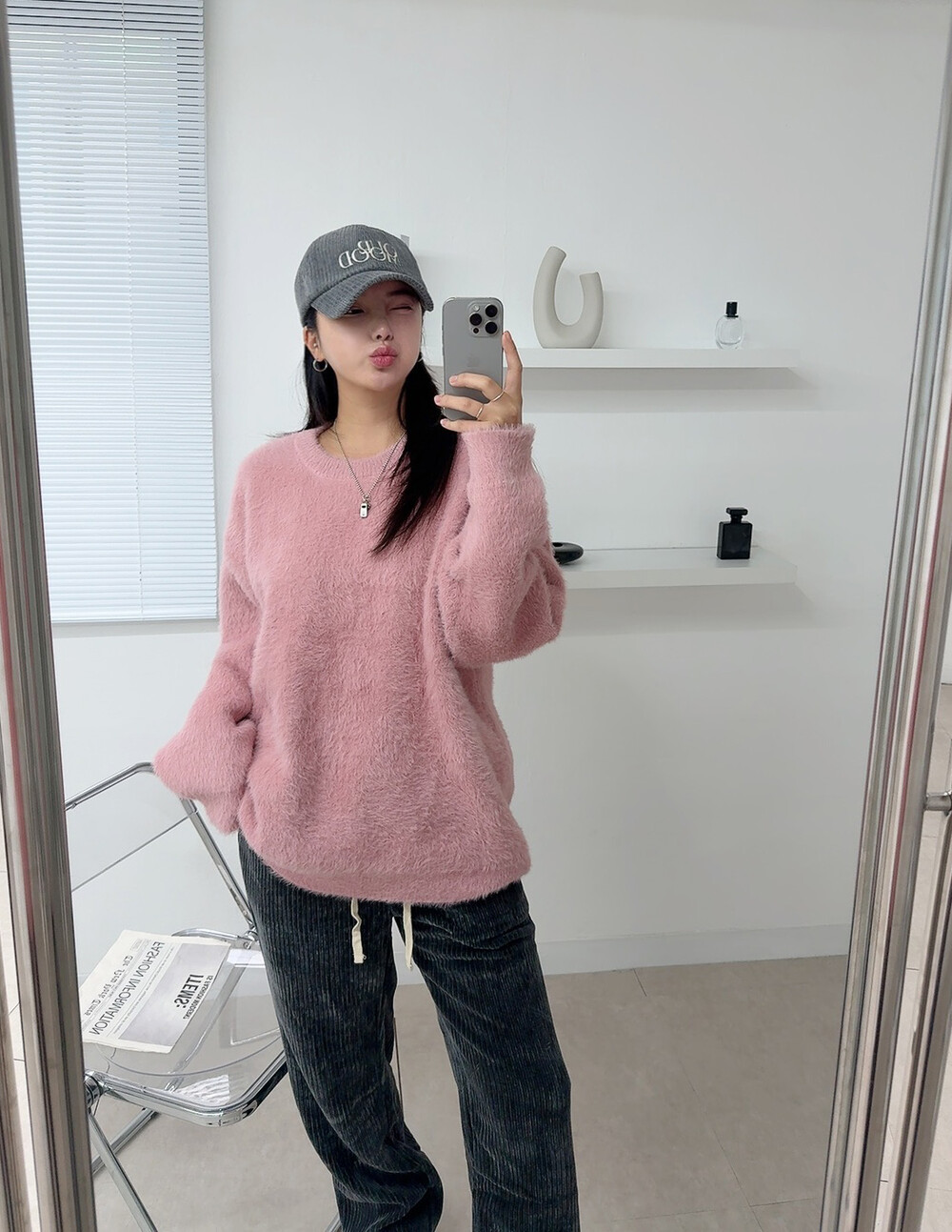 니트 : 핑크 / 모자 : 차콜 / 팬츠 : 차콜