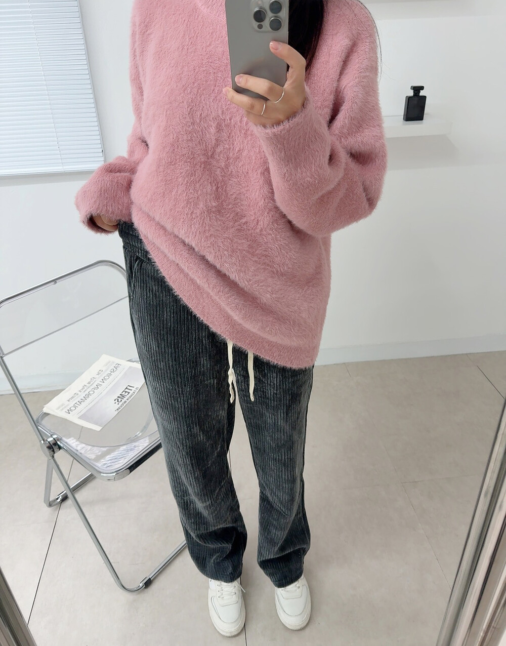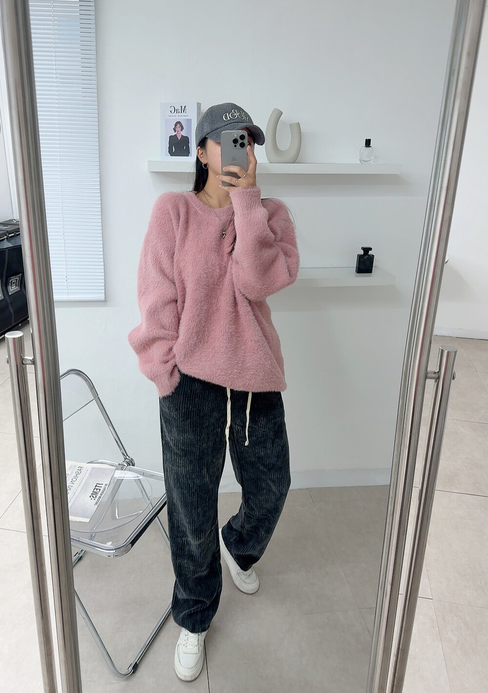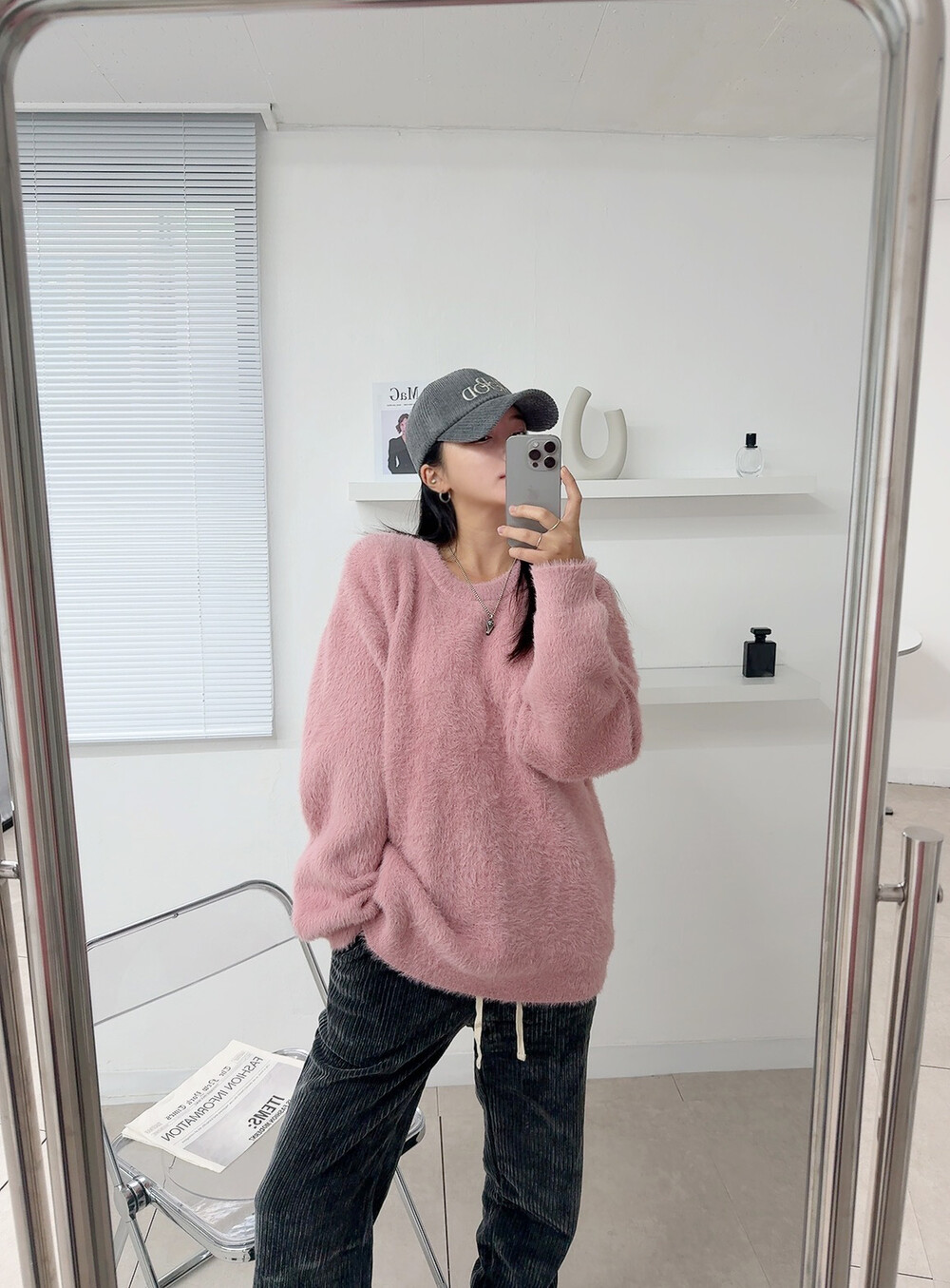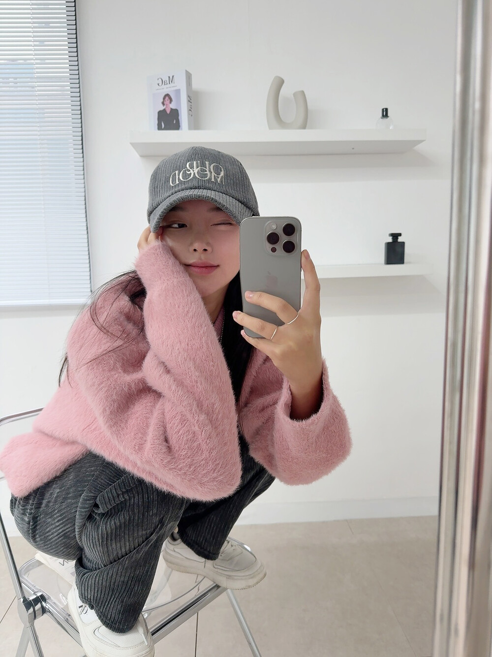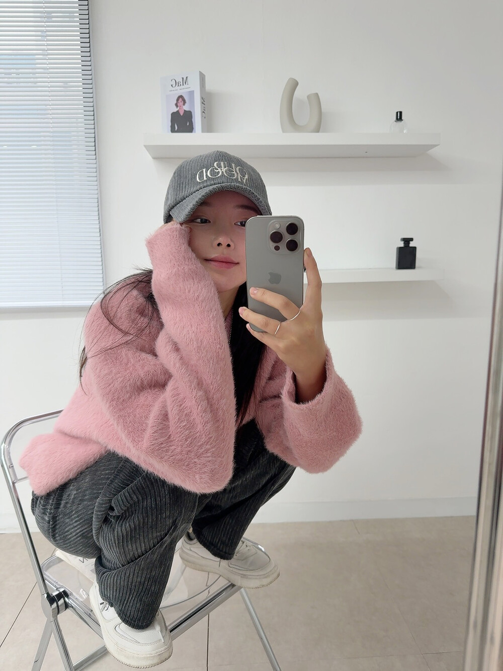 니트 : 핑크 / 모자 : 차콜 / 팬츠 : 차콜